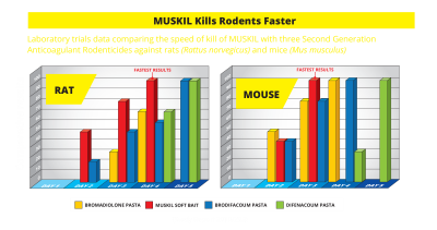 “Muskil outperforms others in terms of speed of kill. In independent trials, Muskil achieved 100% mortality of mice and rats faster than any other anti-coagulant product, including brodifacoum. Yet, surprisingly, it has a reduced risk profile compared to most other anti-coagulant rodenticides to non-target animals, including dogs.