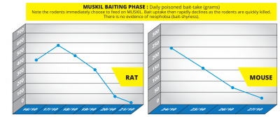 “Muskil’s Fluo-NP Technology contributes to the primary bait acceptance of Muskil, and thereafter the high quality aromatic ingredients and proteins ensure optimal feeding; plus Muskil has been matchlessly formulated to target Australia’s commensal rodent pest species, particularly Rattus rattus and Mus musculus.”
