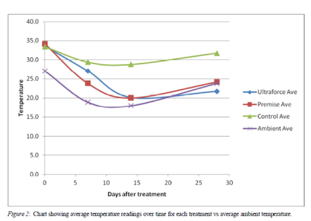 The field trial clearly showed that the Ultraforce Termite Foam killed all termite activity in treated nests within 14days after treatment, as illustrated in the graph (Figure 2) below with nest temperatures dramatically dropping when compared to the control after 7 and 14 days after treatment and treated nest temperatures returning to within 2oC to the ambient temperature at 4 weeks post application.