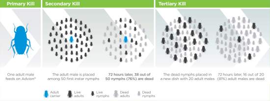 Studies have shown that when a single German Cockroach feeds on ADVION, as many as 38 others receive a lethal dose in the secondary transfer process. Tertiary transfer occurs when dead cockroaches that had been exposed to the original bait pass on a lethal dose to other cockroaches. This research project demonstrated that one cockroach exposed to ADVION resulted in control of up to 54 cockroaches through a three step chain reaction.